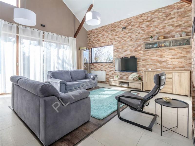 Sercem domu jest spektakularny salon o wysokości aż 6 metrów, który zachwyca przestrzenią i światłem. Duże przeszklenie na całą ścianę otwiera wnętrze na ogród, tworząc niezwykłe poczucie harmonii z naturą. Salon został wzbogacony o stylową antresolę oraz eleganckie, dębowe schody, które nadają wnętrzu wyjątkowego charakteru.
